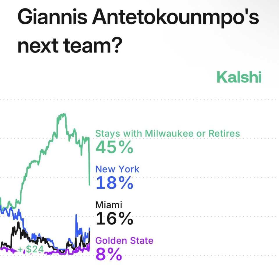 外媒Kaishi显示,字母哥留队概率降至45%,也就是说他离队的概率已经达到55%,其中,尼克斯获得字母哥的概率是18%,热火是16%,勇士8%。